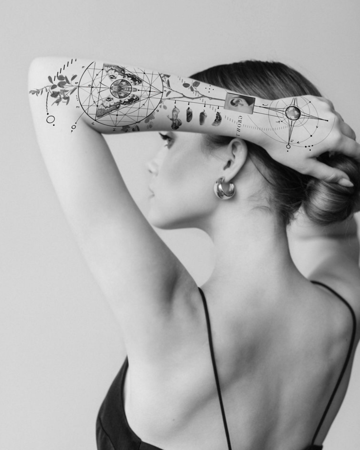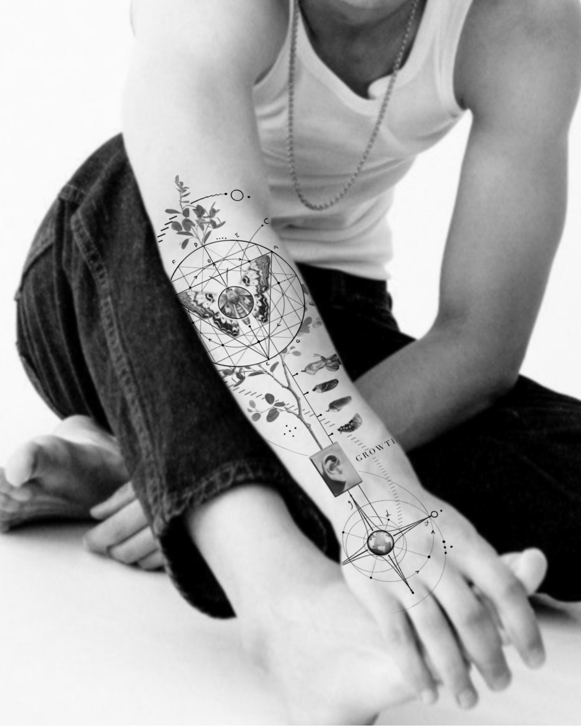 • Unveil the art of transformation with this striking forearm tattoo design. This design embodies the balance between structure and organic growth. It’s a symbol of introspection, evolution, and the power of listening to the world around you. Ideal for those seeking a meaningful tattoo that speaks to their journey of self-discovery and personal growth.